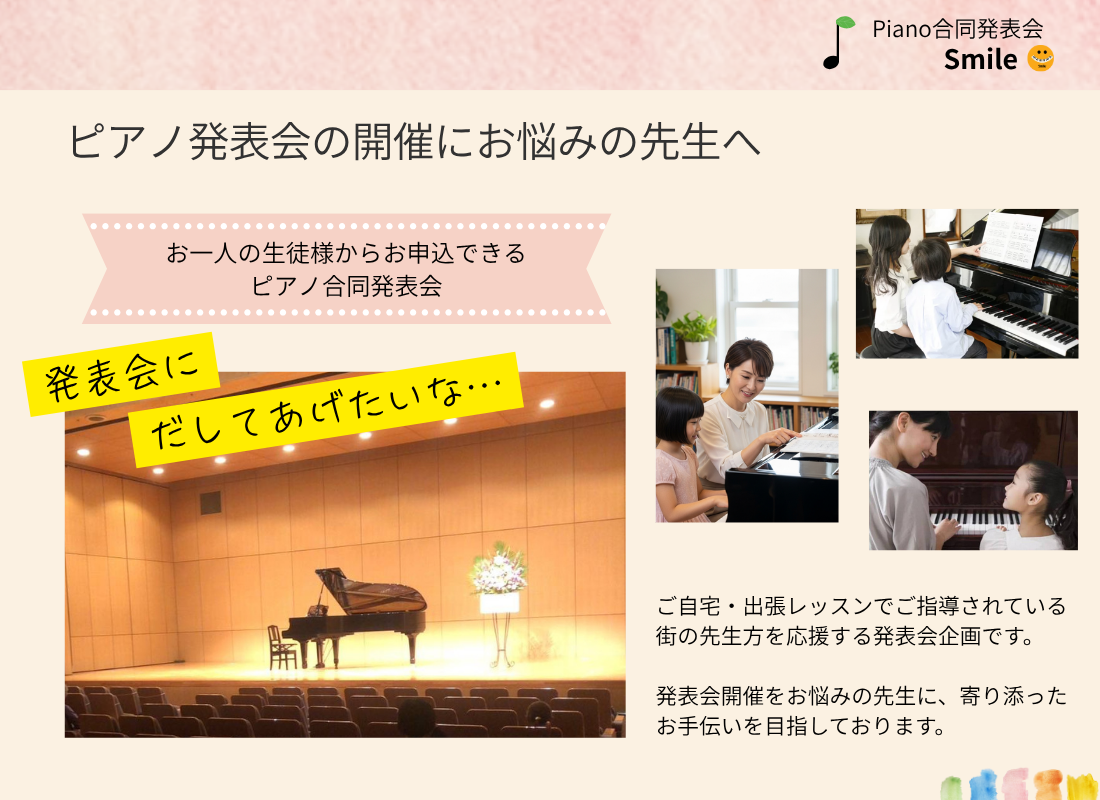 ピアノ発表会事務局「Smile」は、福岡県 及び、その近隣の県でご指導されている先生方とその生徒様を対象とした、合同発表会の企画・運営を専門に行っております。