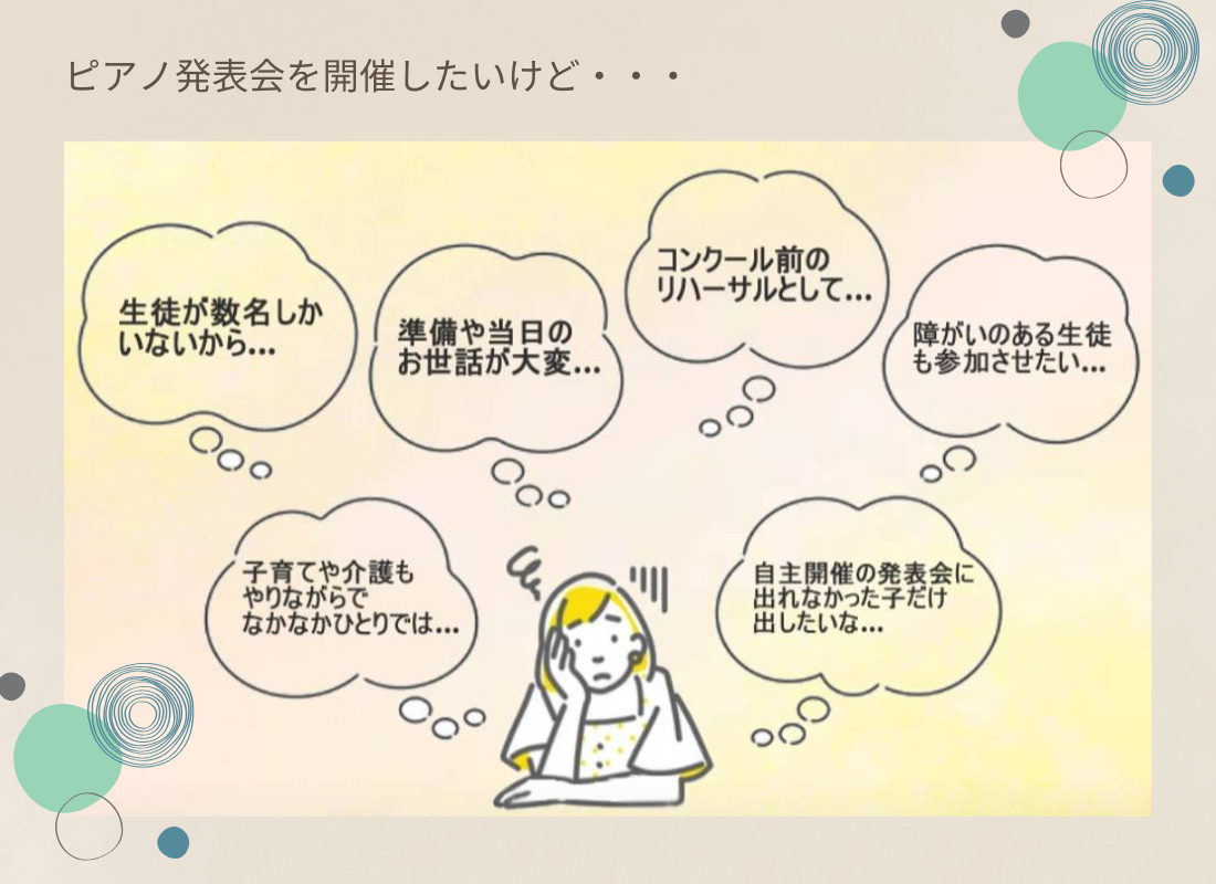 生徒さんが一生懸命練習した曲を披露する機会を大切にしたいと考えておりますので、次回への参加などもご提案できます。