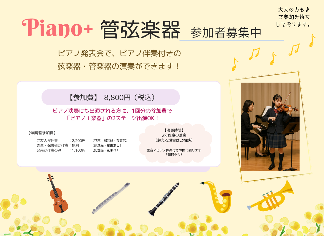 「始めたばかりで…」という初心者の方も、「昔、吹奏楽部で…」という楽器経験者の方も大歓迎です。ピアノ伴奏で管楽器や弦楽器を演奏する方も大募集中!