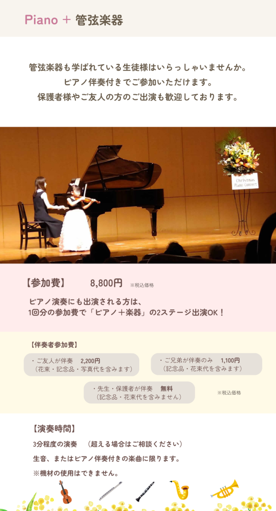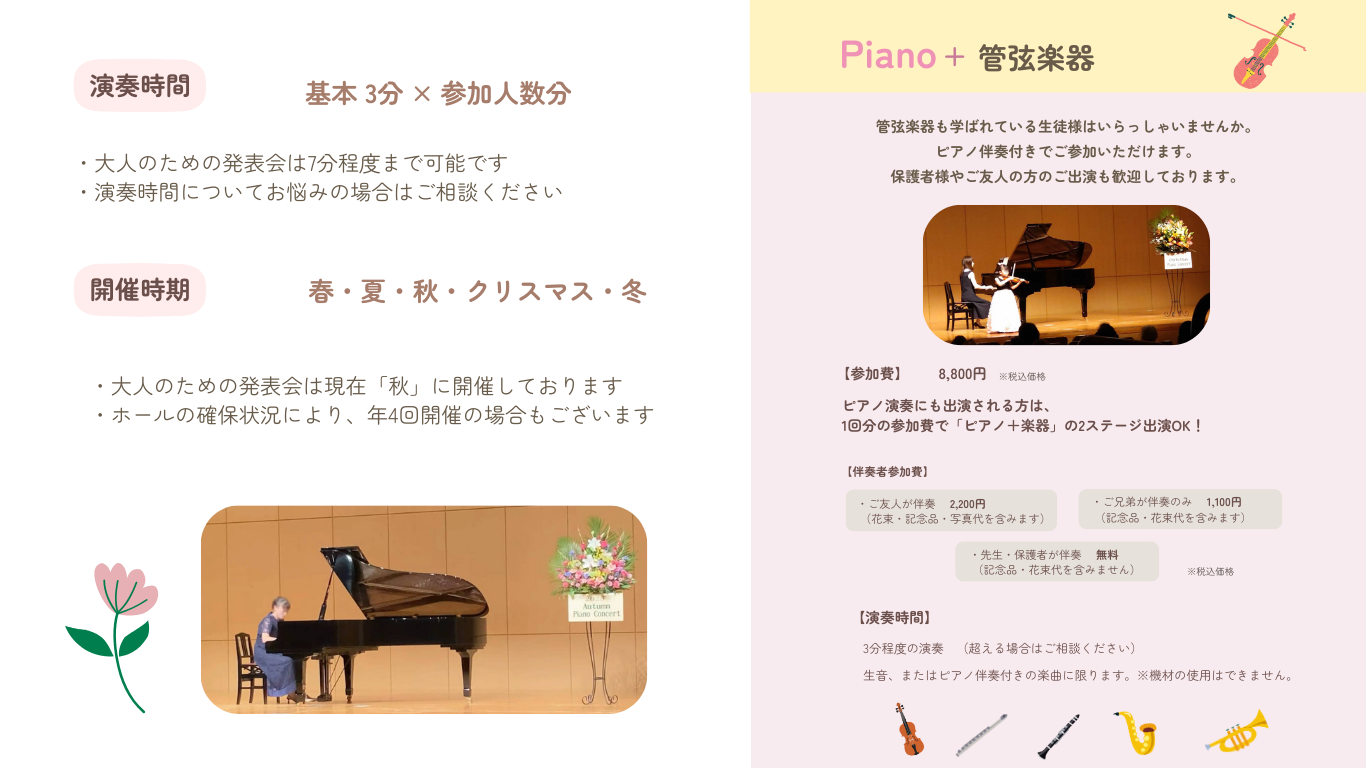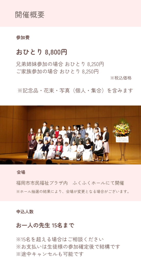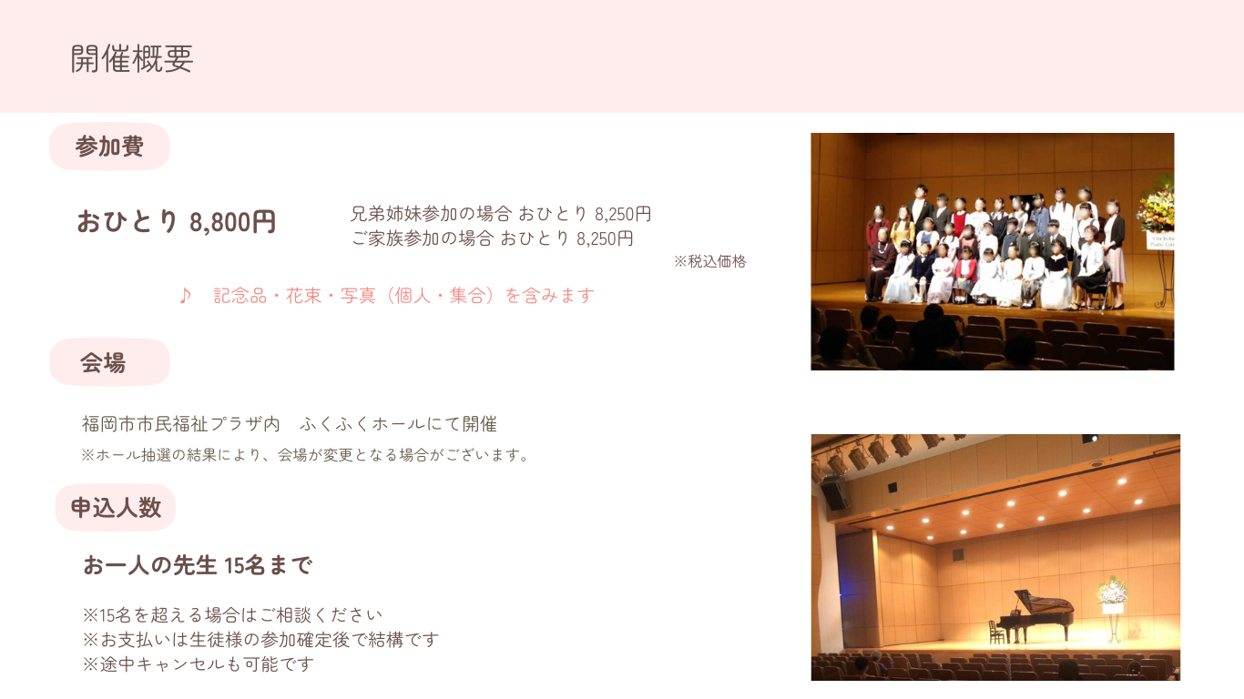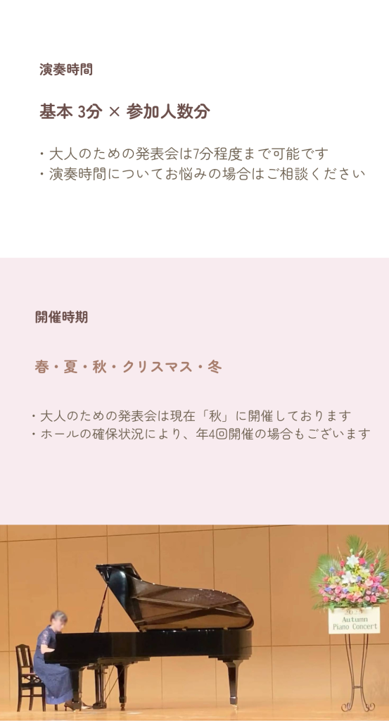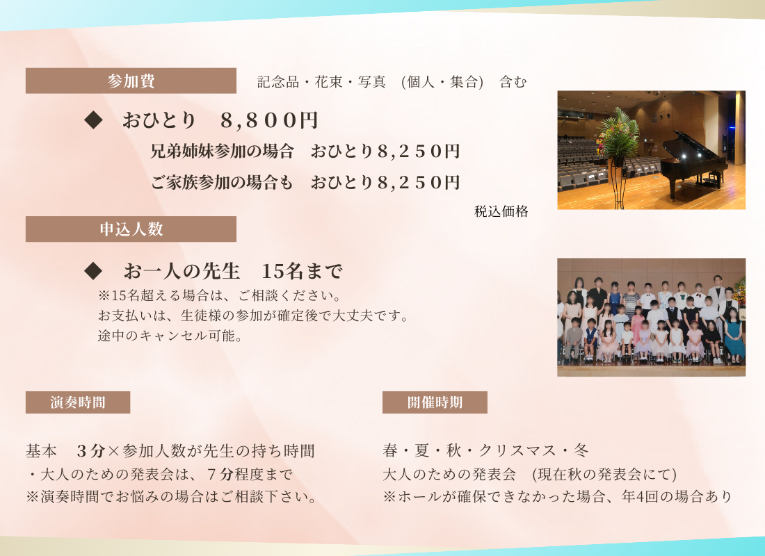 | ・申込み | 受付中です🎹✨ ※子ども中心の発表会になります。 ◆大人の方の出演も可能です(子どもの部と一緒になります) |