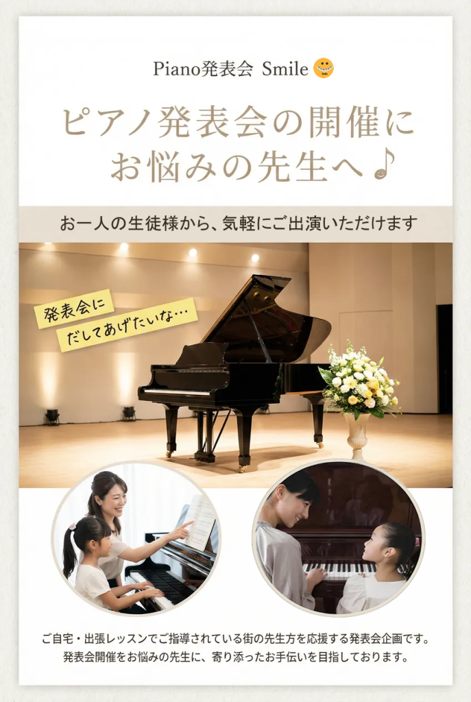 ピアノ発表会事務局「Smile」は、福岡県 及び、その近隣の県でご指導されている先生方とその生徒様を対象とした、合同発表会の企画・運営を専門に行っております。