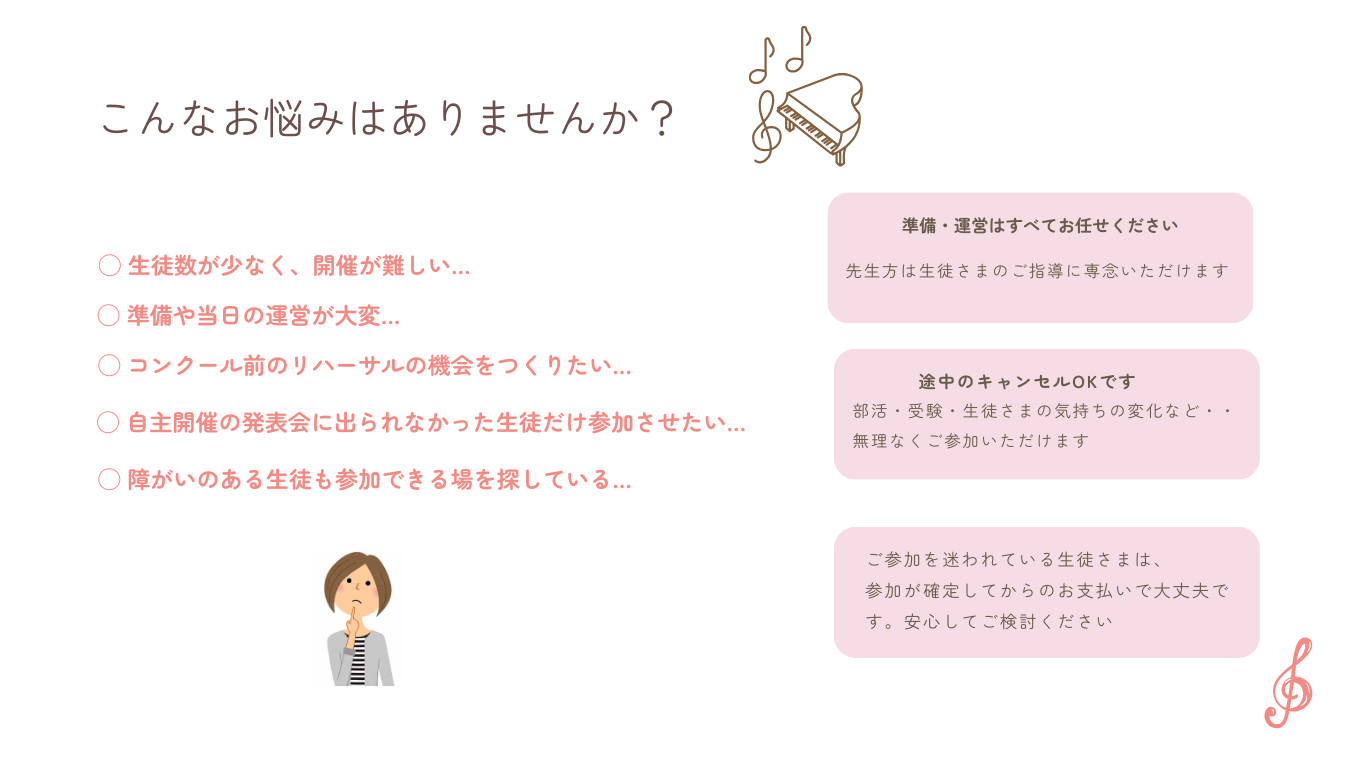 生徒さんが一生懸命練習した曲を披露する機会を大切にしたいと考えておりますので、次回への参加などもご提案できます。