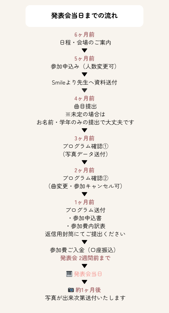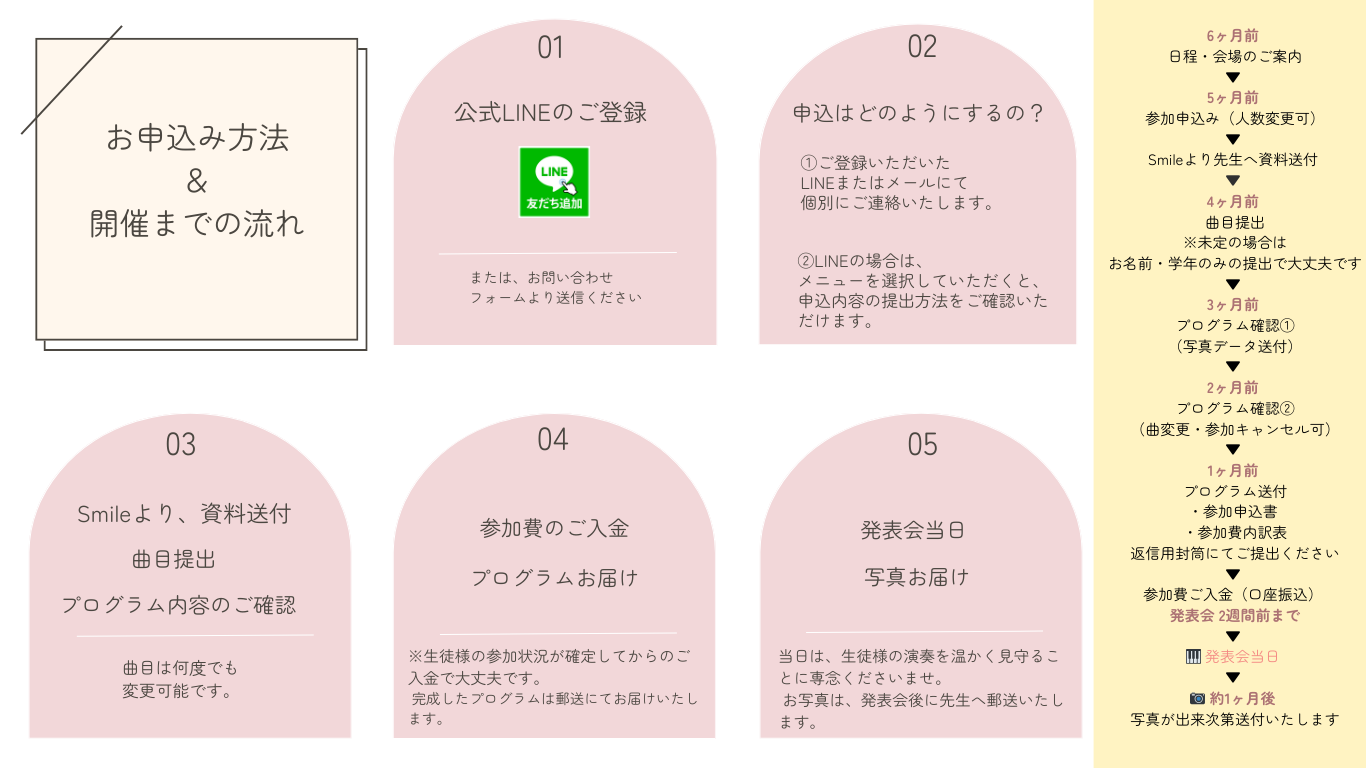![]() | ピアノ発表会 Smile LINE登録 参加費や当日までの流れ 参加申込資料など~ 詳細はこちらから確認できます👆 |