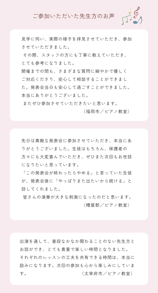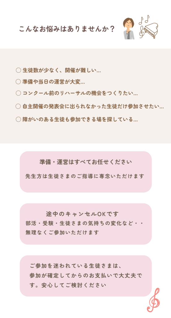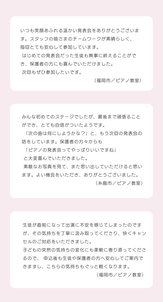 また、生徒さんが一生懸命練習した曲を披露する機会を大切にしたいと考えておりますので、次回への参加などもご提案できます。
